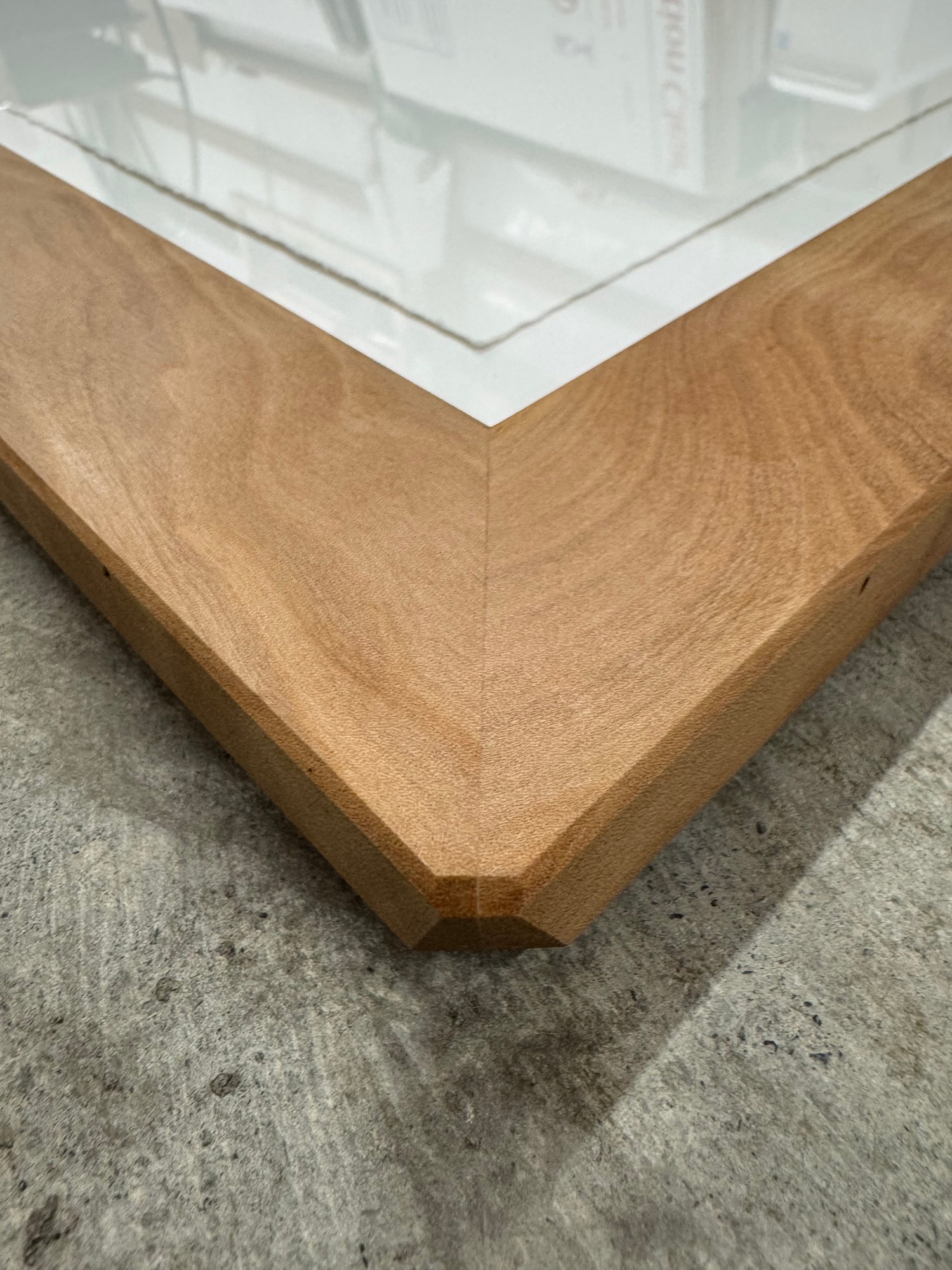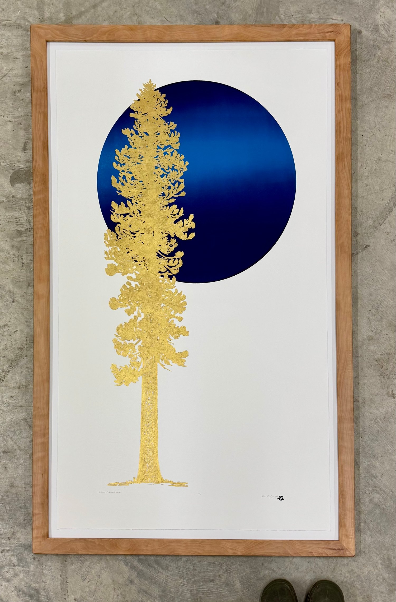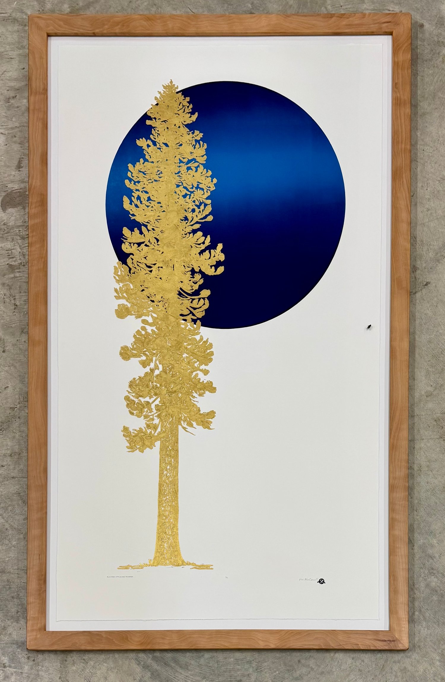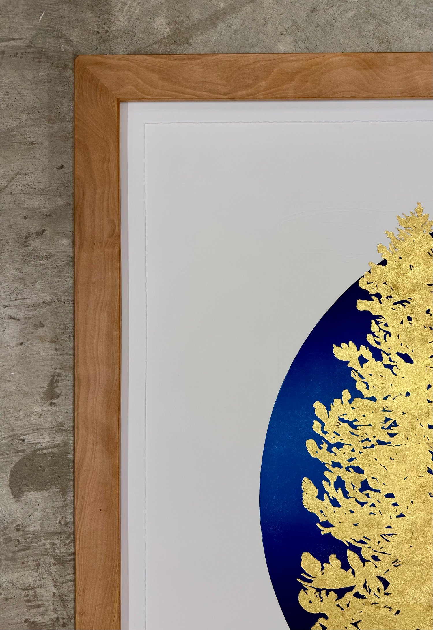 Monotype, 24k gold leaf, hand-pulled linocut print on acid-free cotton rag framed in a handmade madrone frame. The print is archivally framed with TruVue Museum Glass.