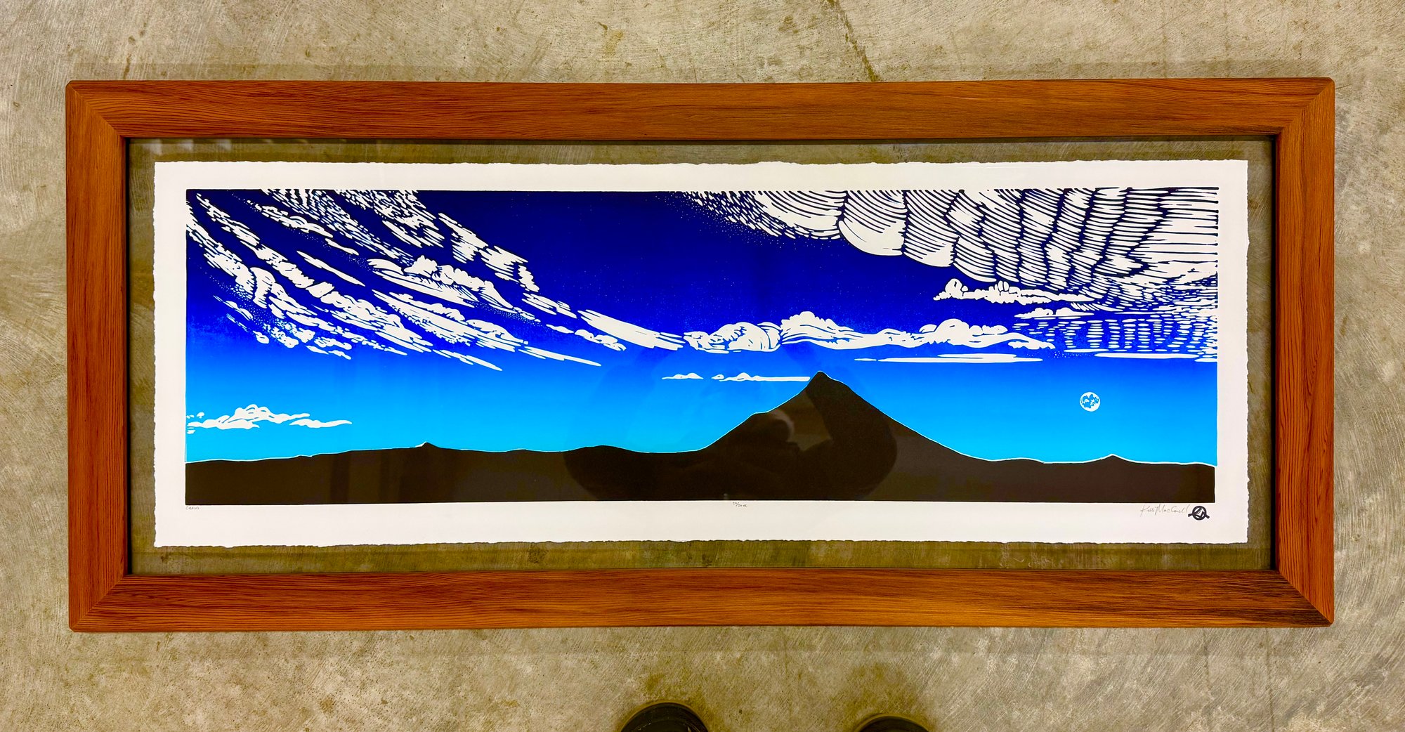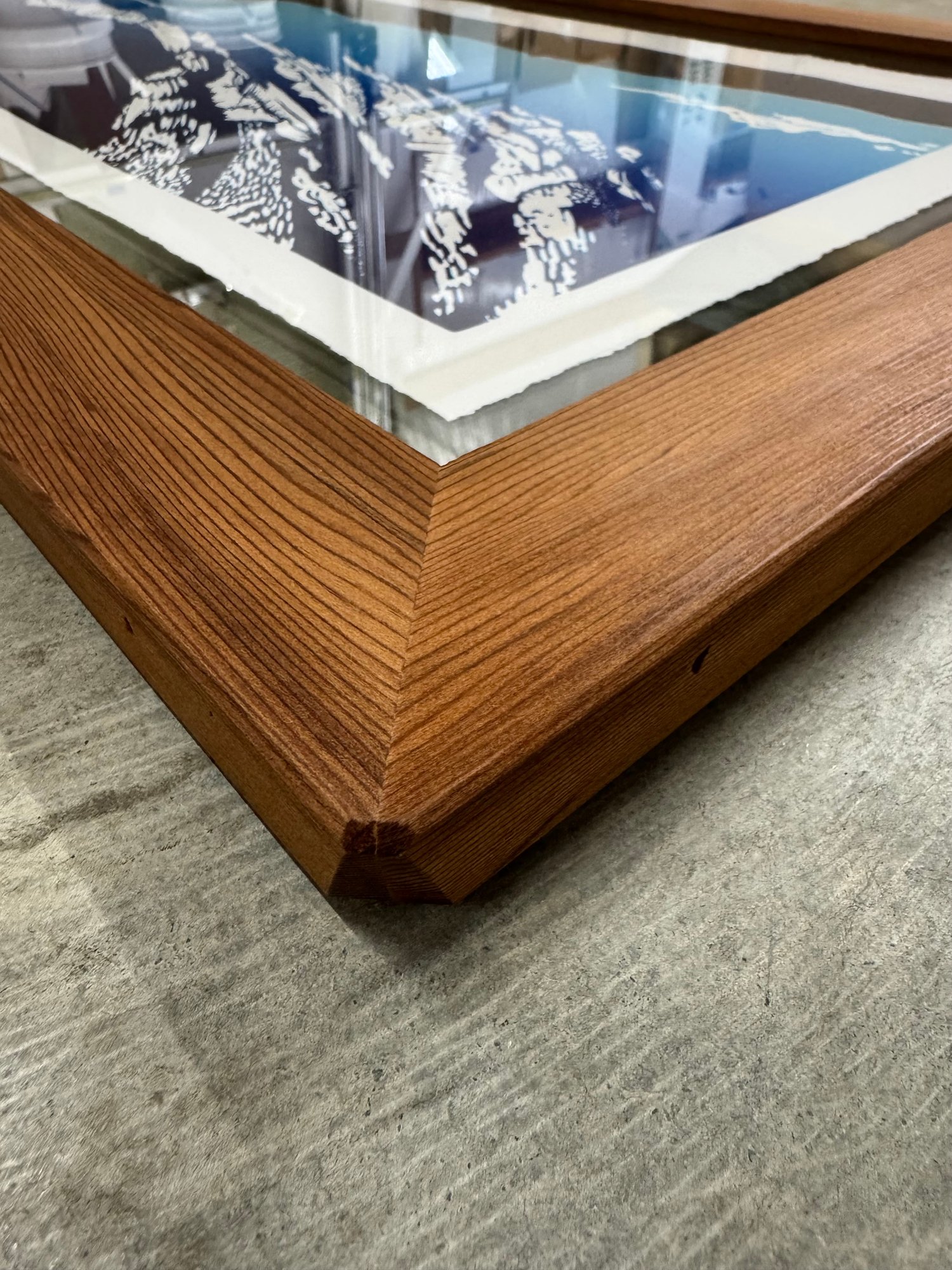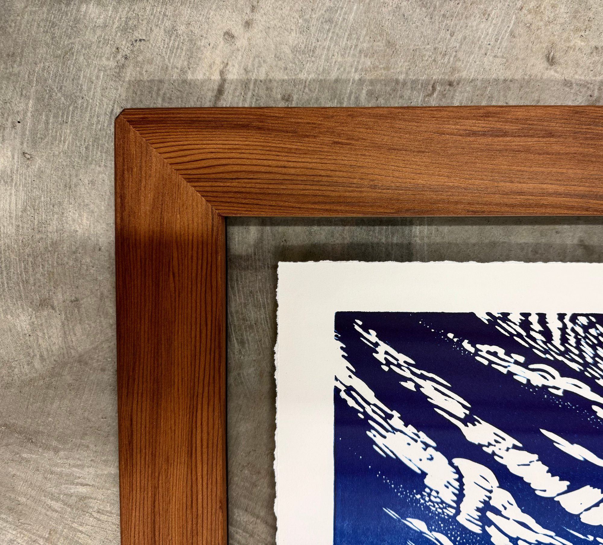 Limited edition hand-pulled linocut print on acid-free cotton rag framed in a handmade salvaged redwood frame. The print is archivally framed with TruVue UV protective Conservation Clear glass.