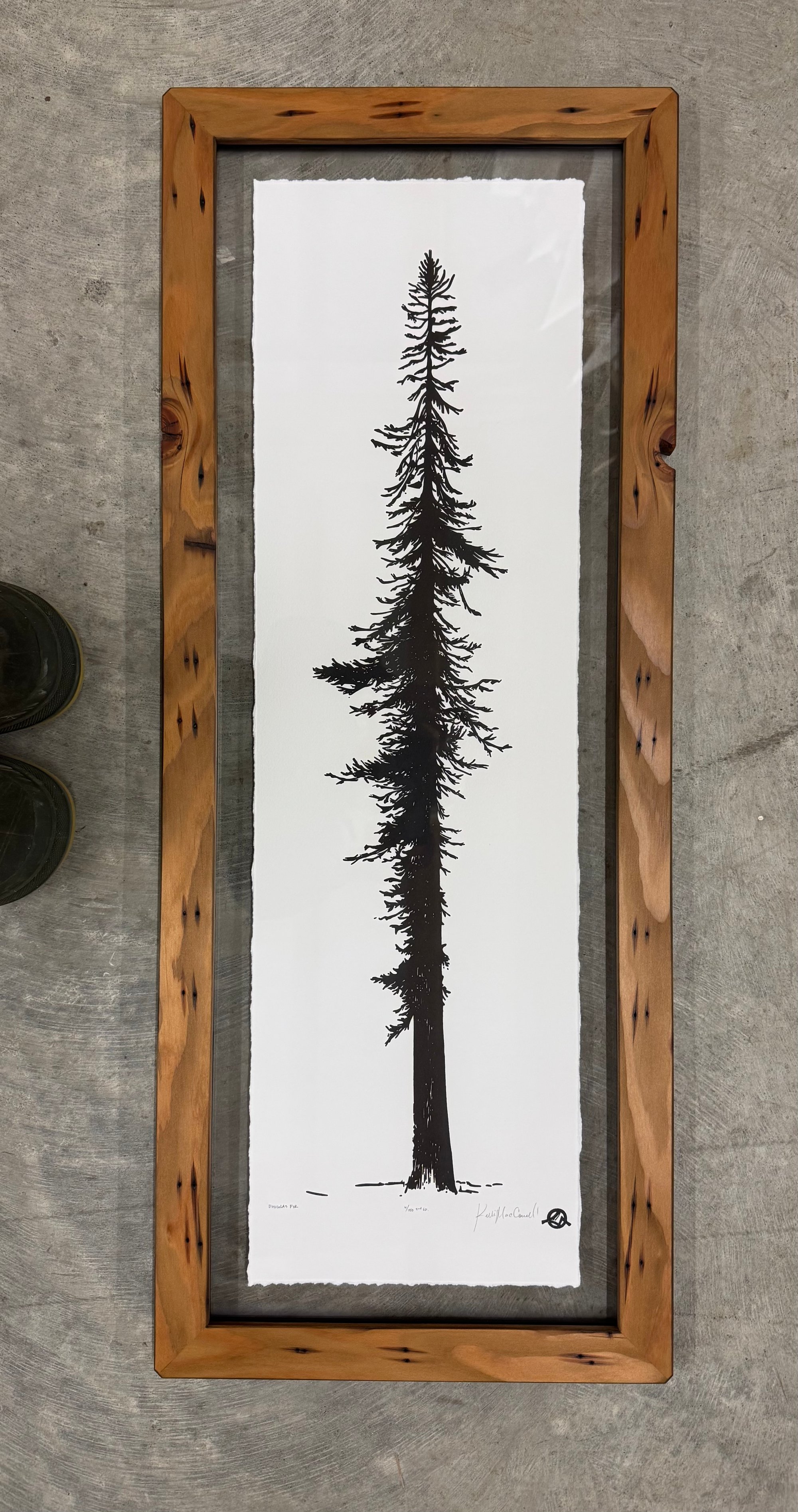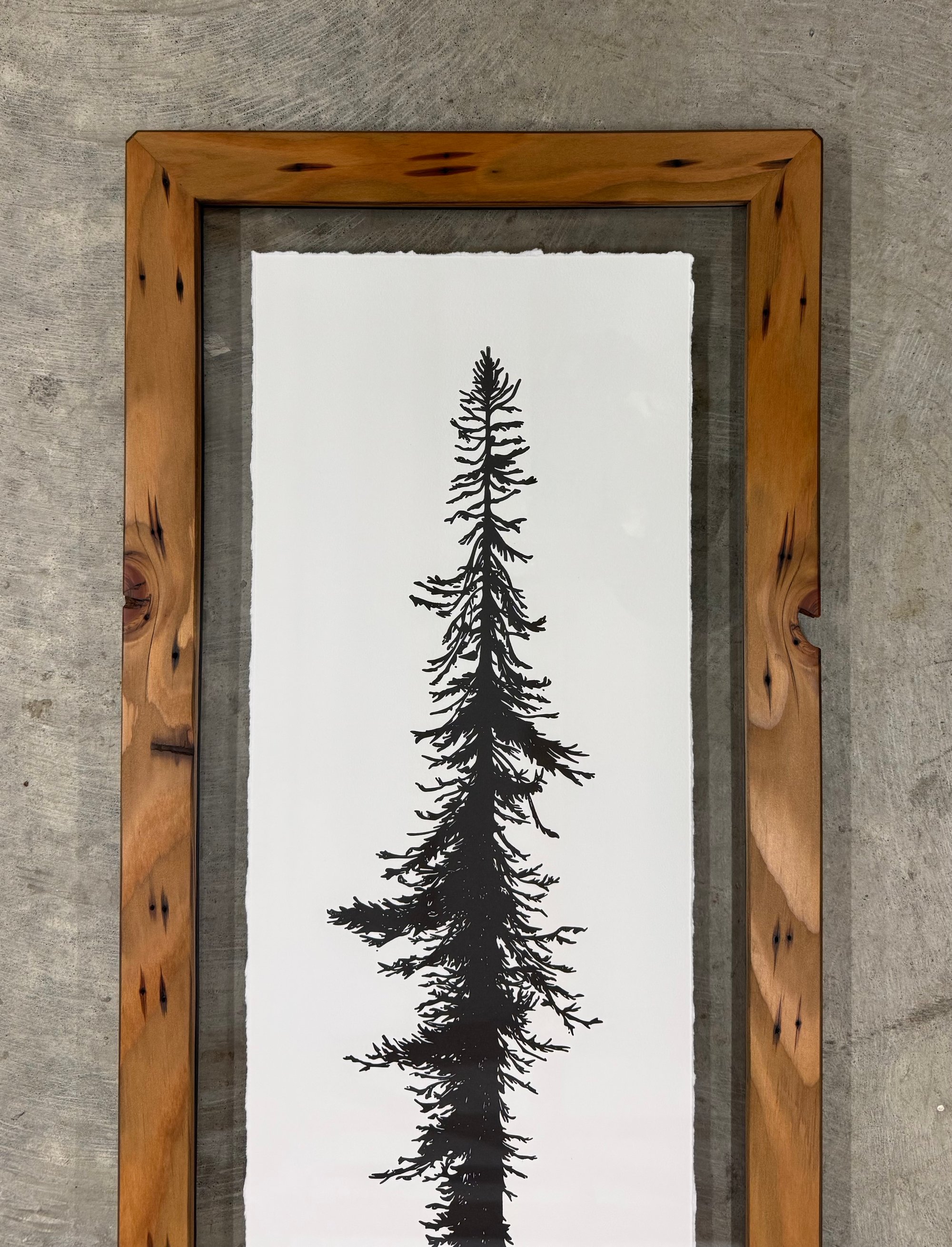 Limited edition hand-pulled letterpress print on acid-free cotton rag framed in a handmade fir frame. The print is archivally framed with TruVue UV protective Conservation Clear glass.