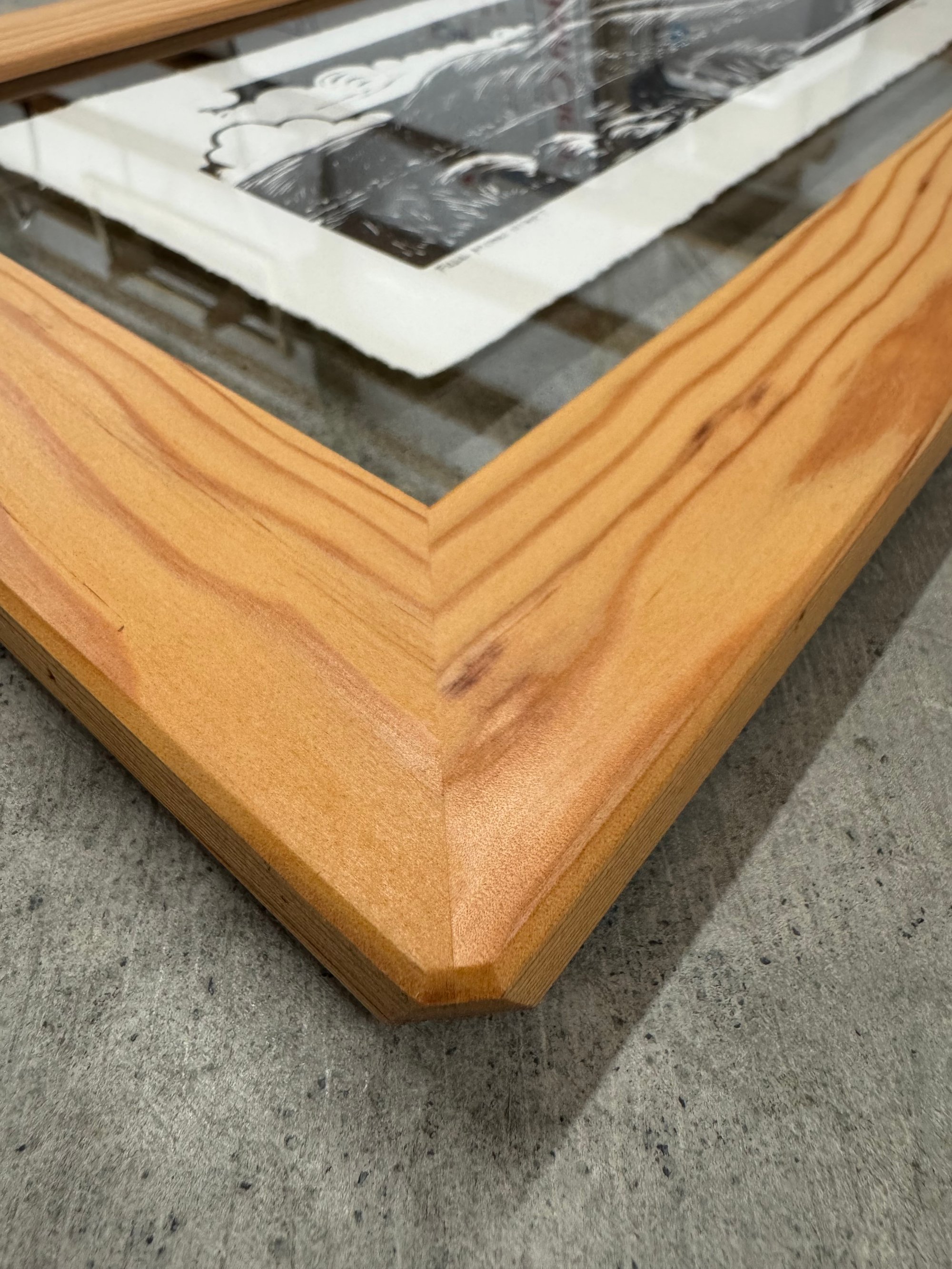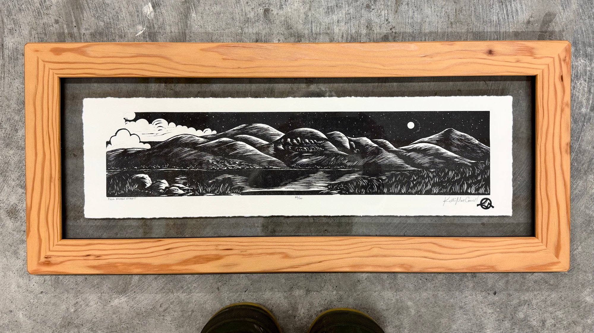 Limited edition hand-pulled linocut print on acid-free cotton rag framed in a handmade fir frame. The print is archivally framed, and the glass is TruVue UV protective Conservation Clear.