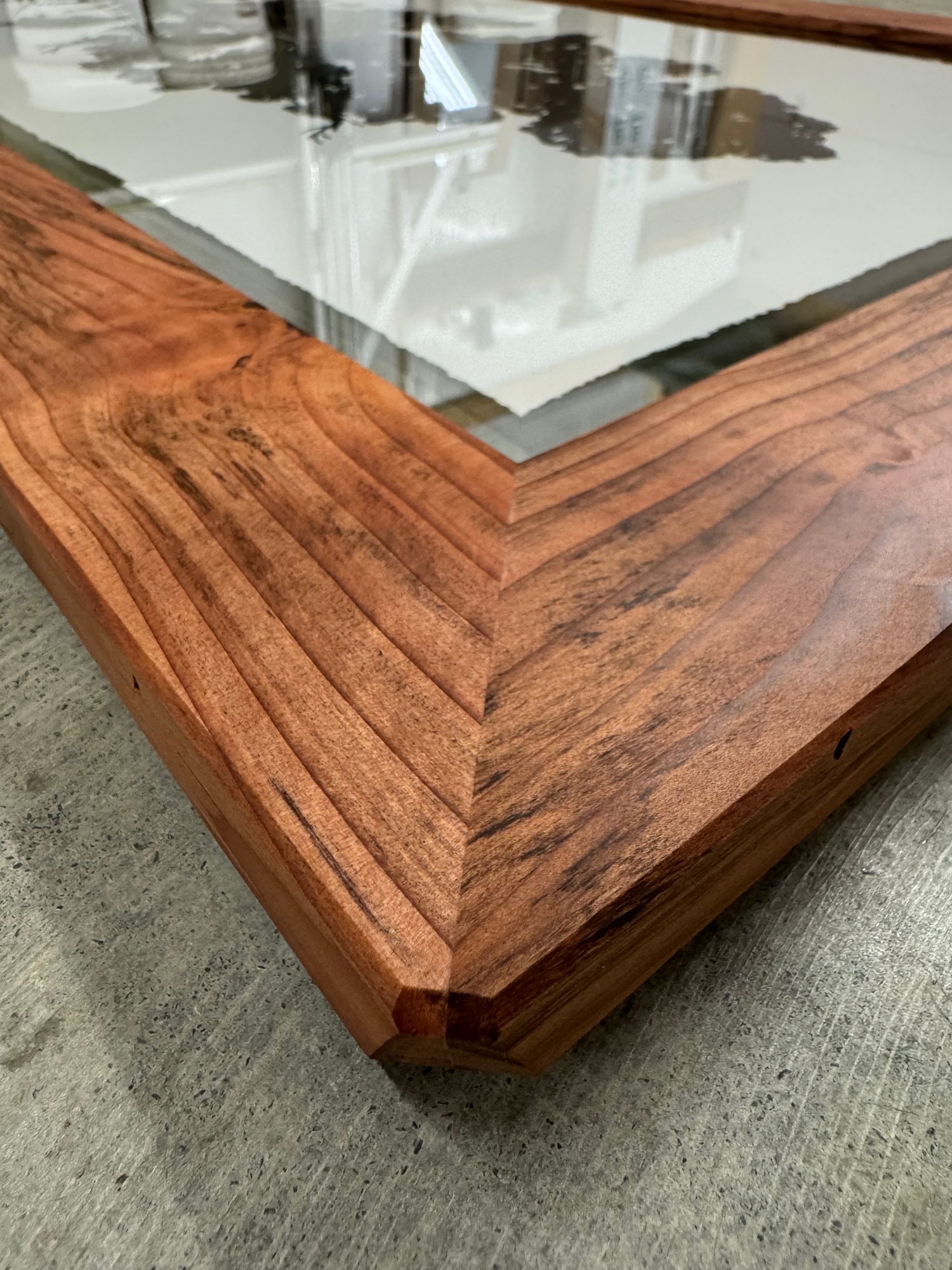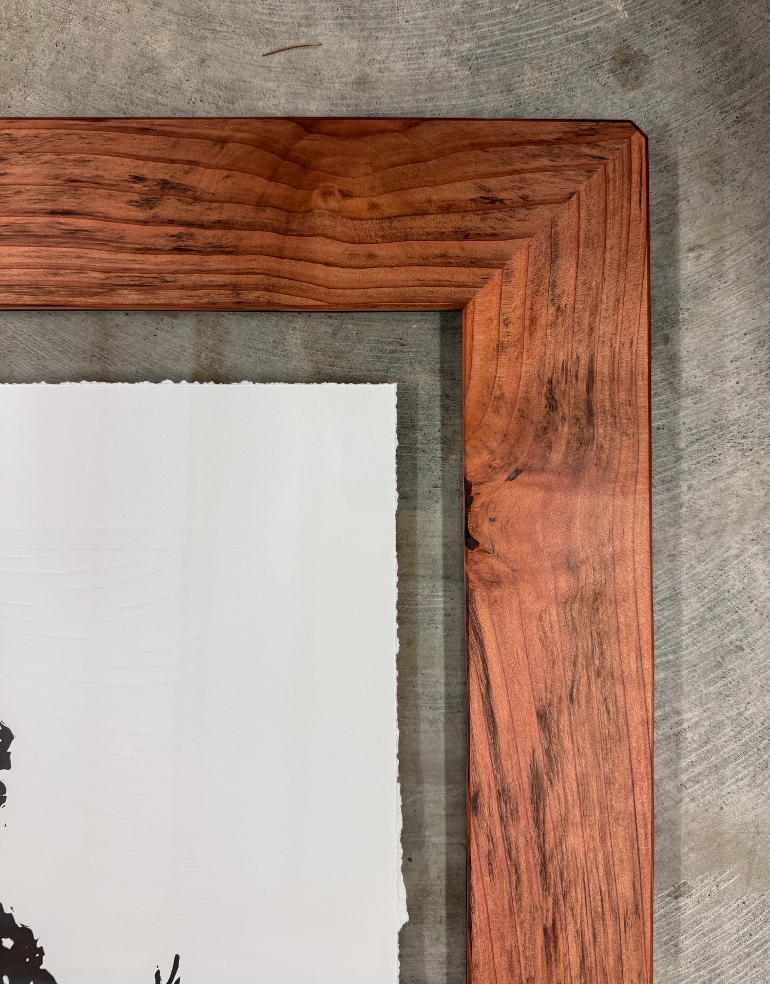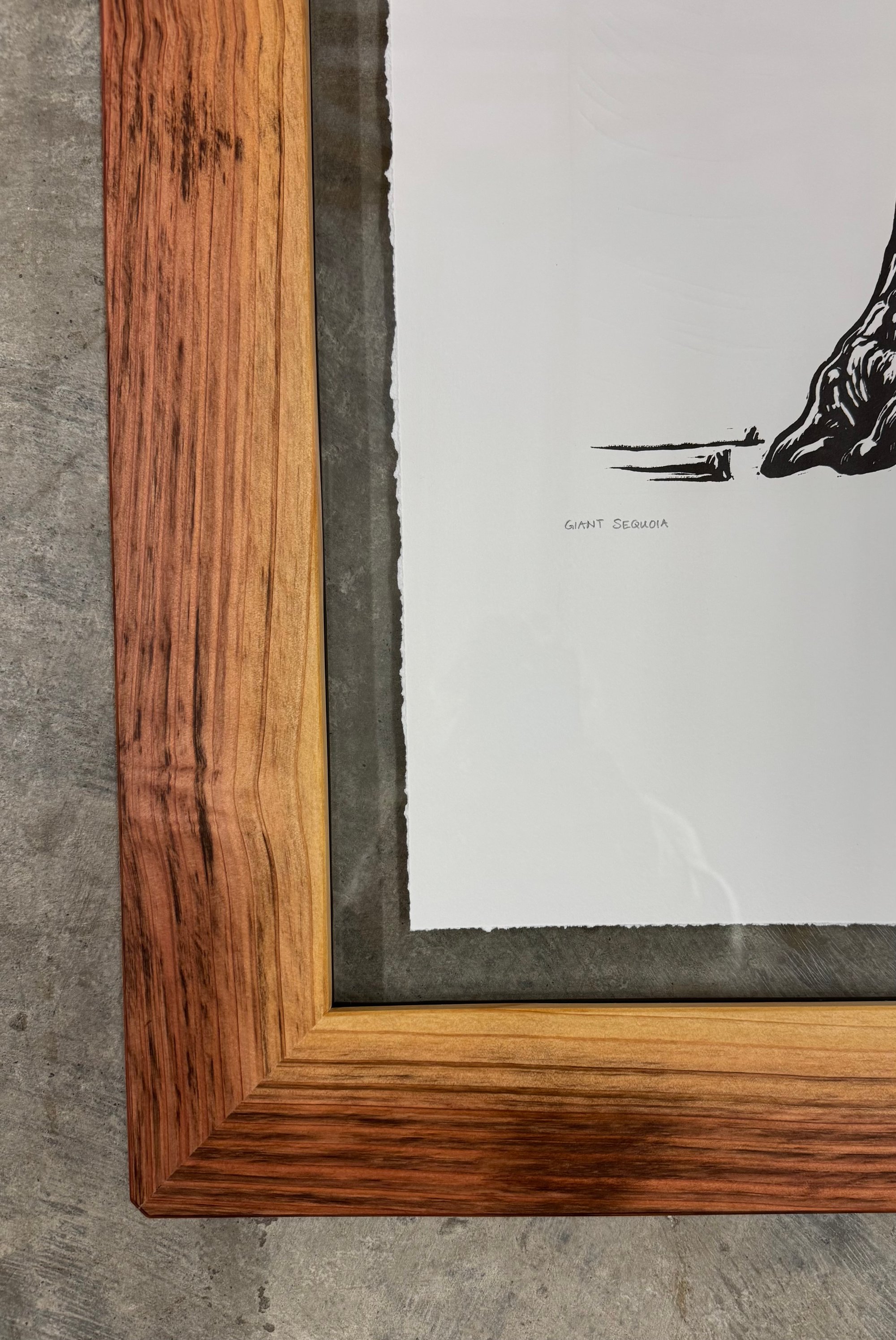 Limited edition hand-pulled linocut print on acid-free cotton rag framed in a handmade salvaged sequoia frame. The print is archivally framed with TruVue UV protective Conservation Clear glass.