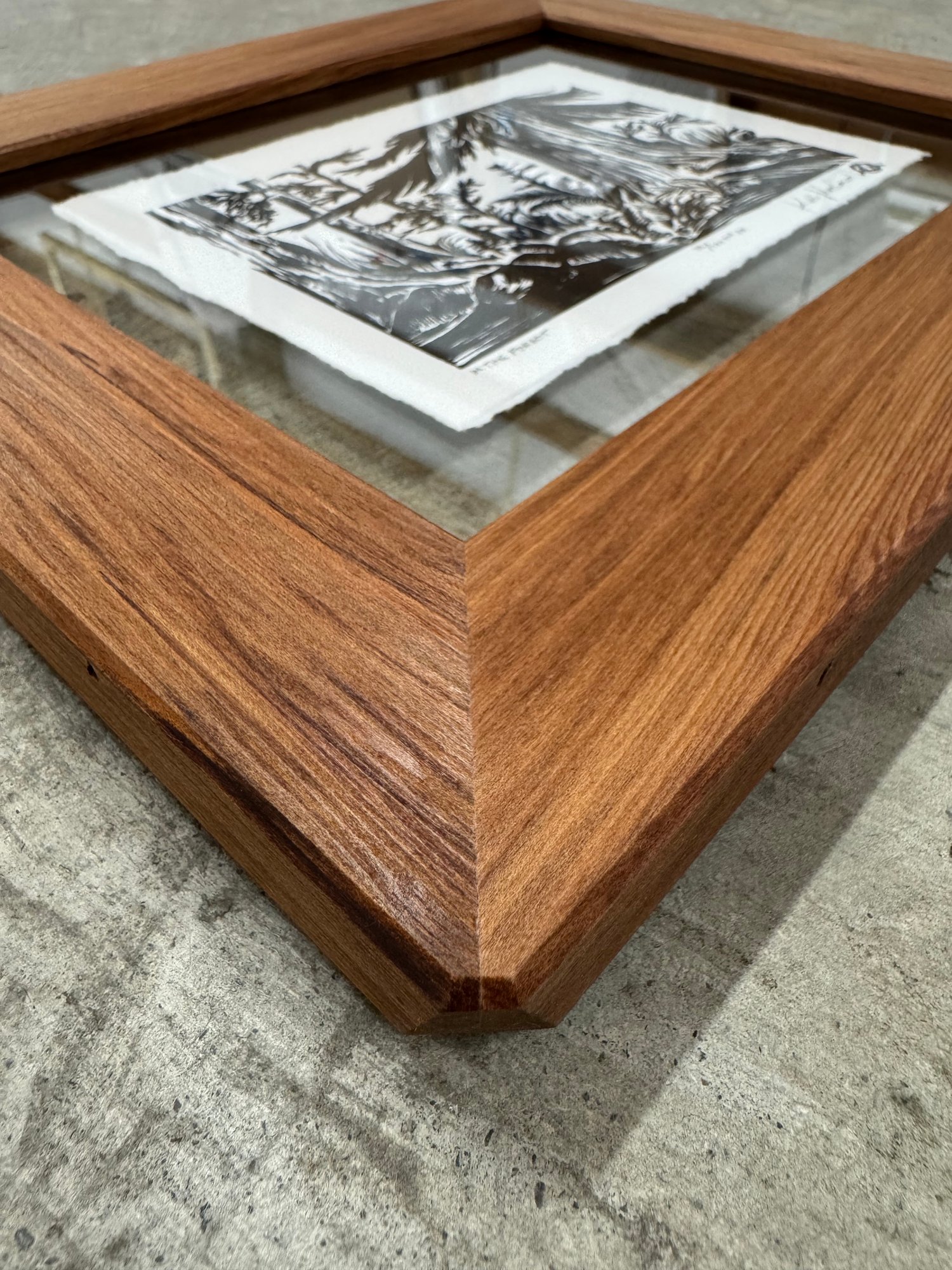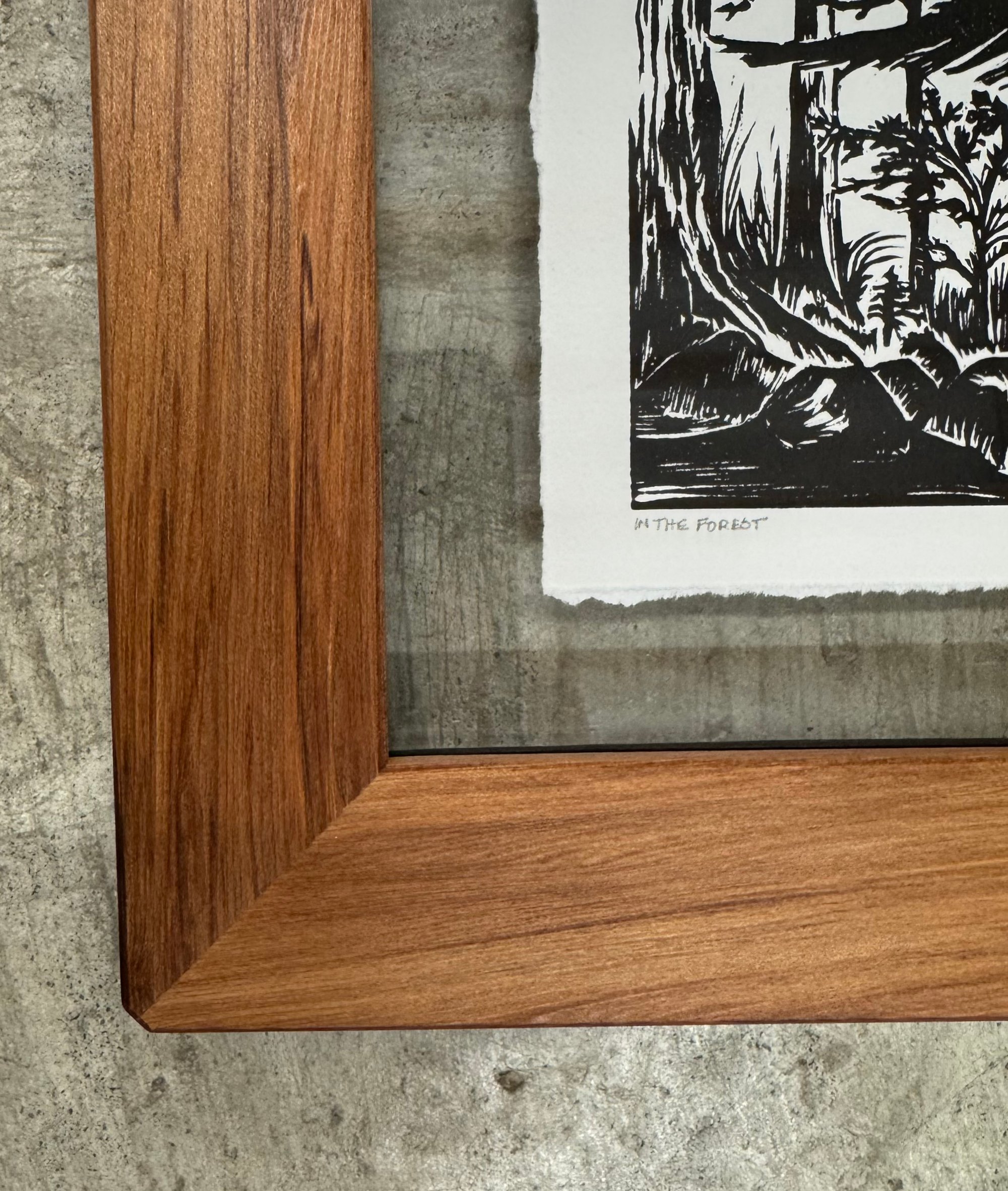 Limited edition hand-pulled linocut print on acid-free cotton rag framed in a handmade redwood frame. The print is archivally framed with TruVue UV protective Conservation Clear glass.