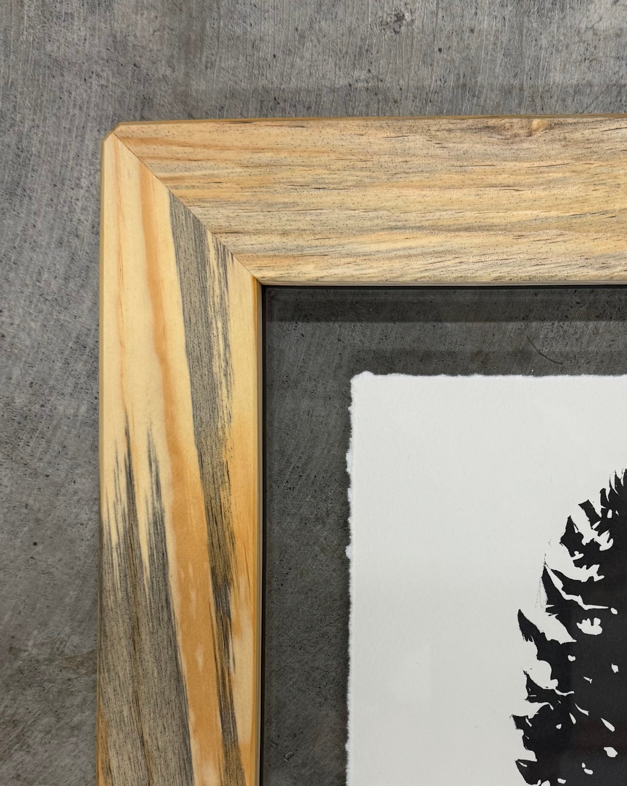 Limited edition hand-pulled linocut print on acid-free cotton rag framed in a handmade pine frame. The print is archivally framed with TruVue UV protective Conservation Clear glass.