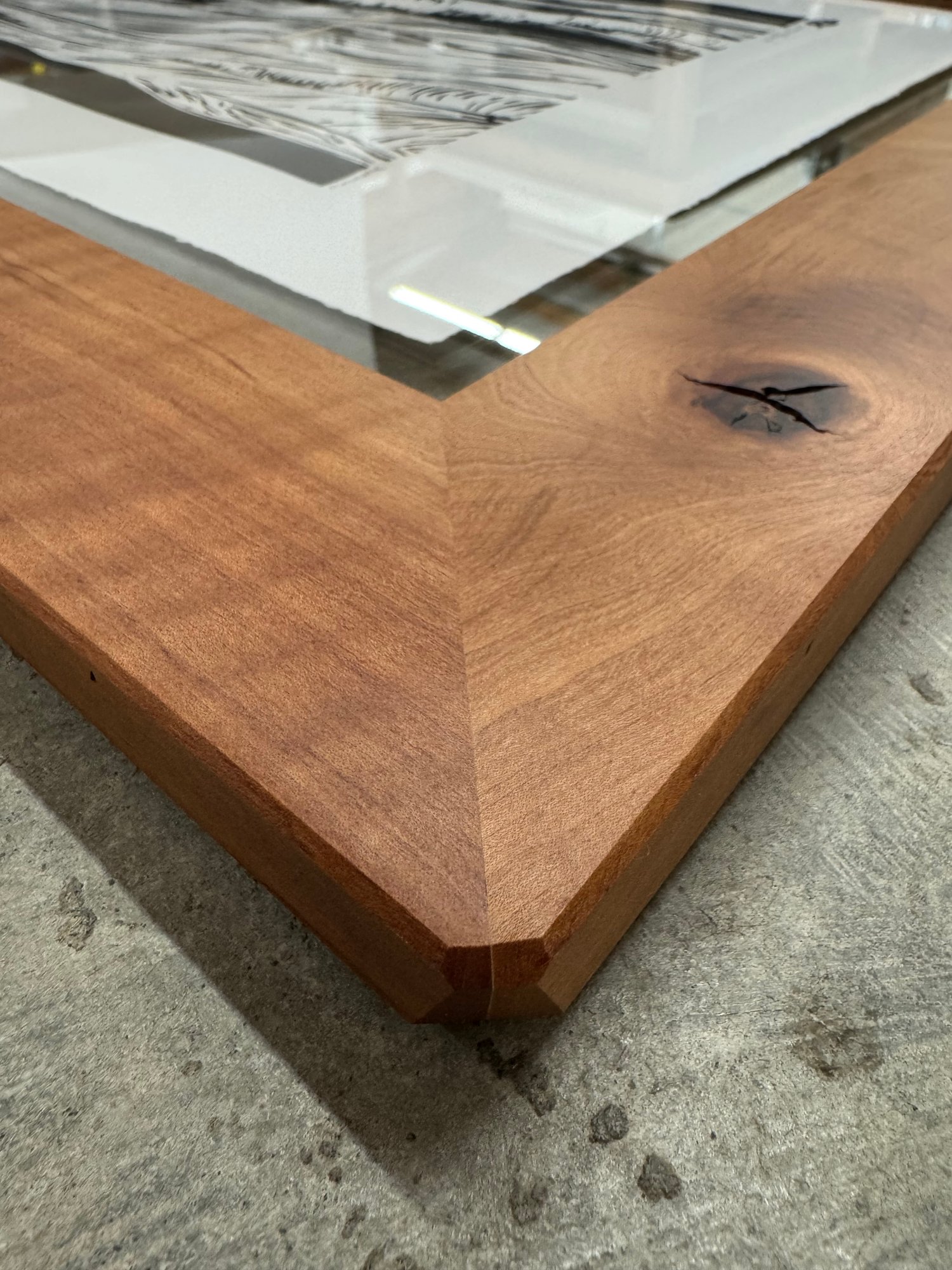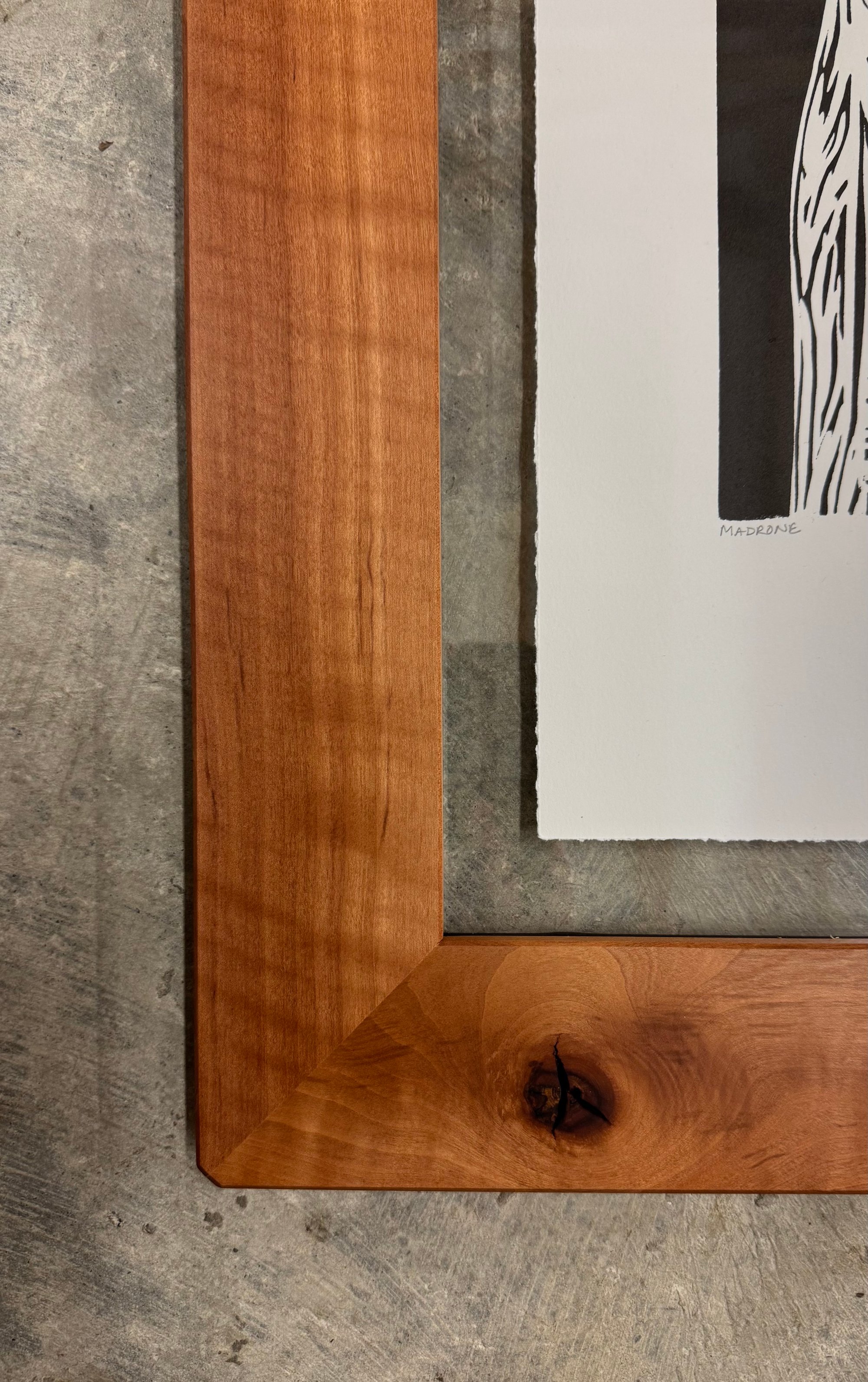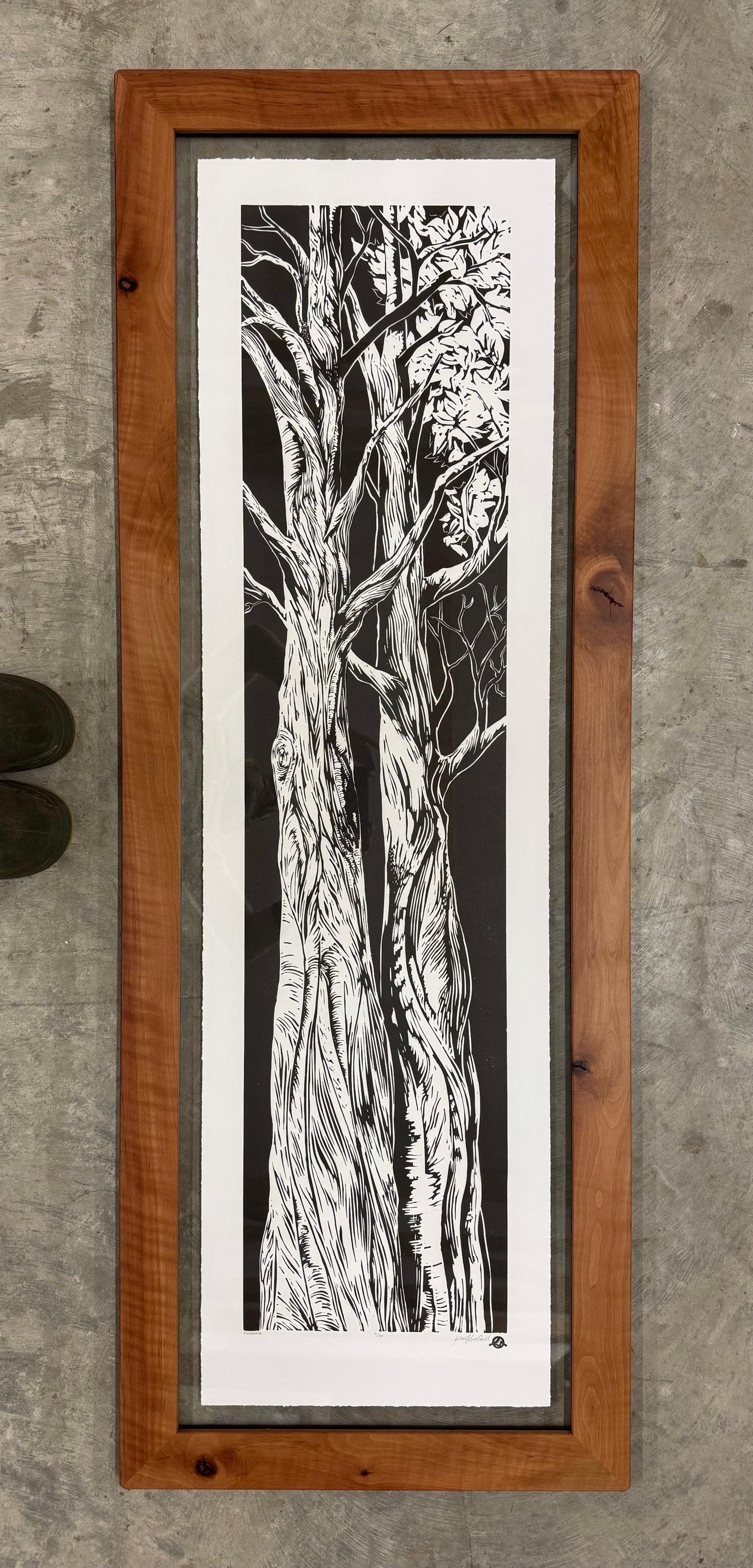 Limited edition hand-pulled linocut print on acid-free cotton rag framed in a handmade madrone frame. The print is archivally framed, and the glass is TruVue UV protective Conservation Clear.
