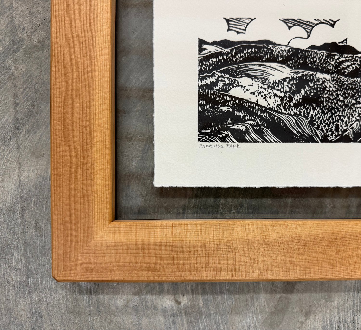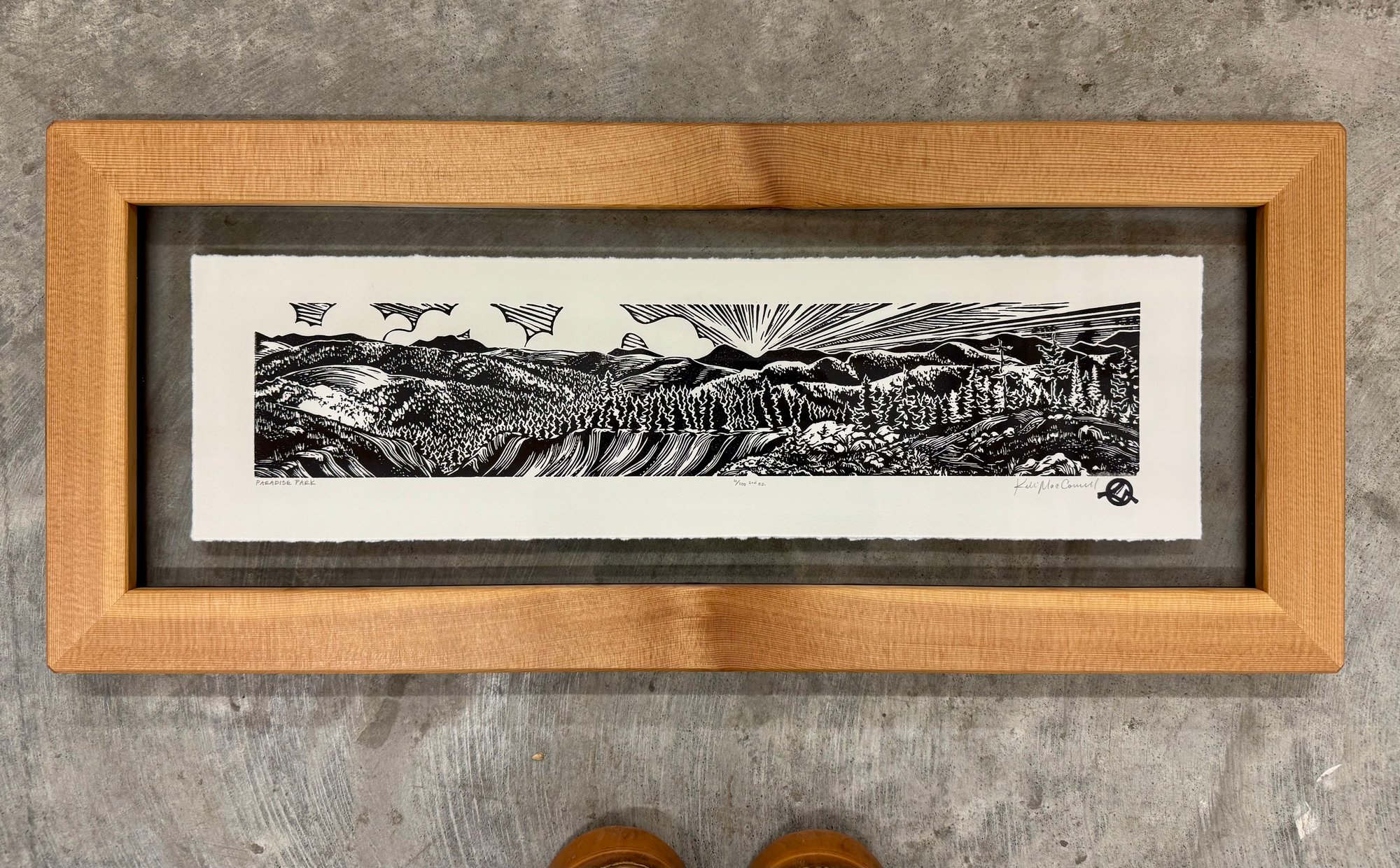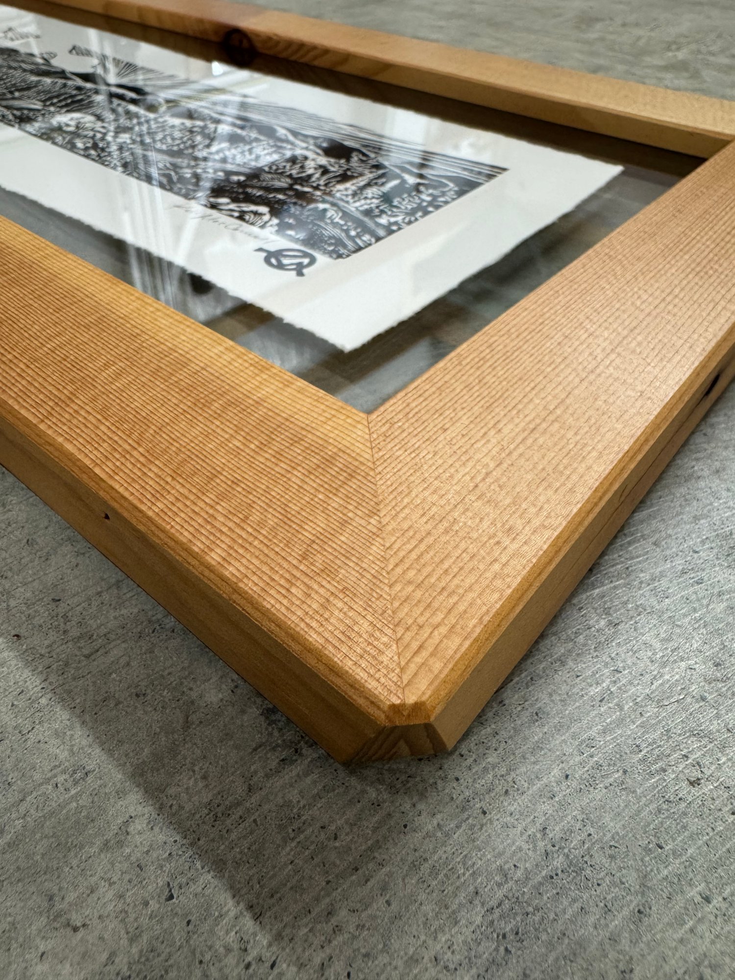 Limited edition hand-pulled linocut print on acid-free cotton rag framed in a handmade fir frame. The print is archivally framed with TruVue UV protective Conservation Clear glass.