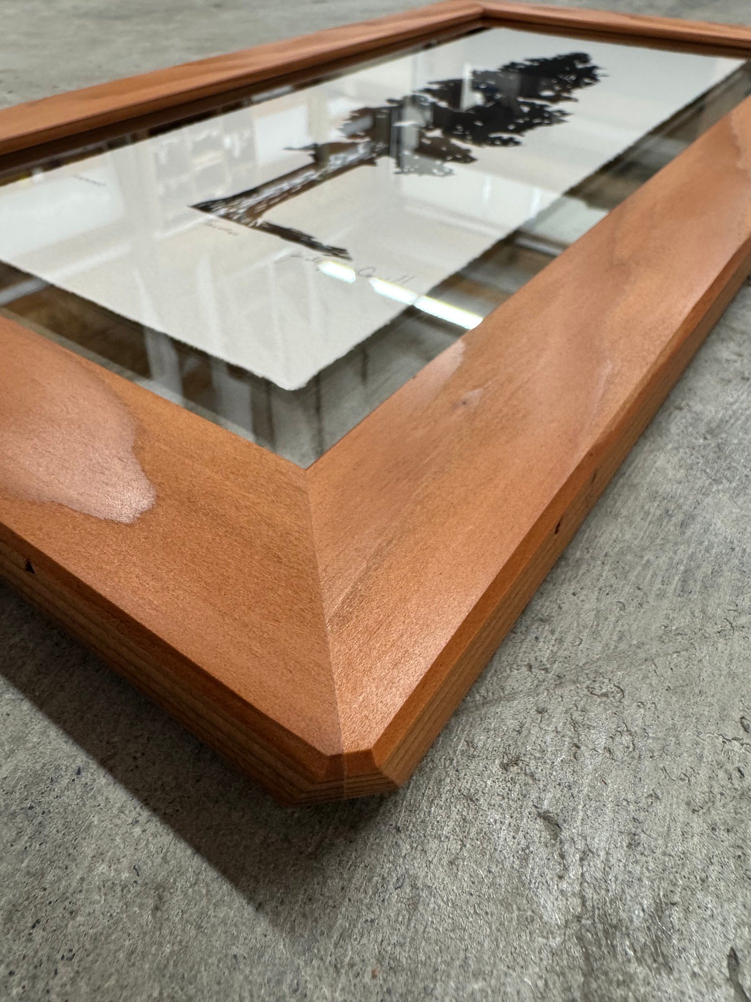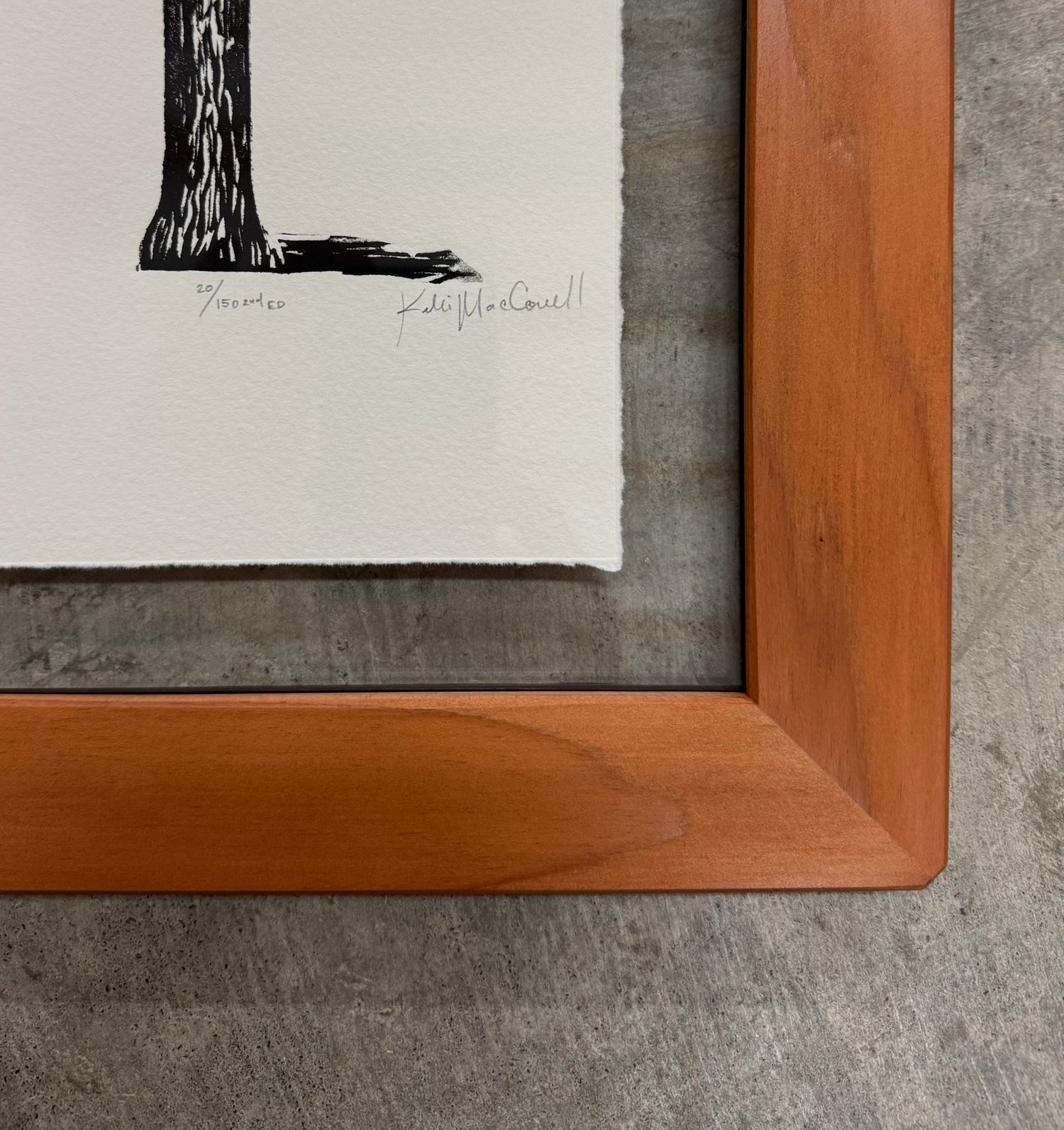 Limited edition hand-pulled linocut print on acid-free cotton rag framed in a handmade redwood frame. The print is archivally framed with TruVue UV protective Conservation Clear glass.