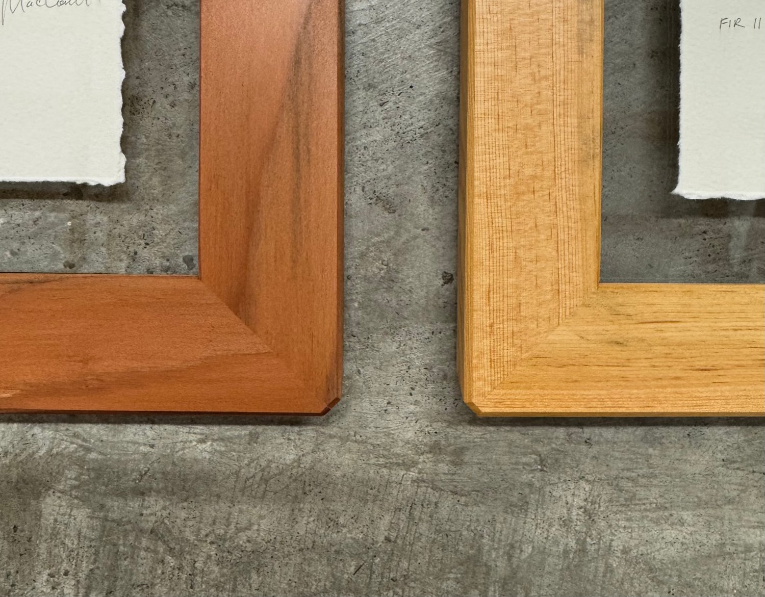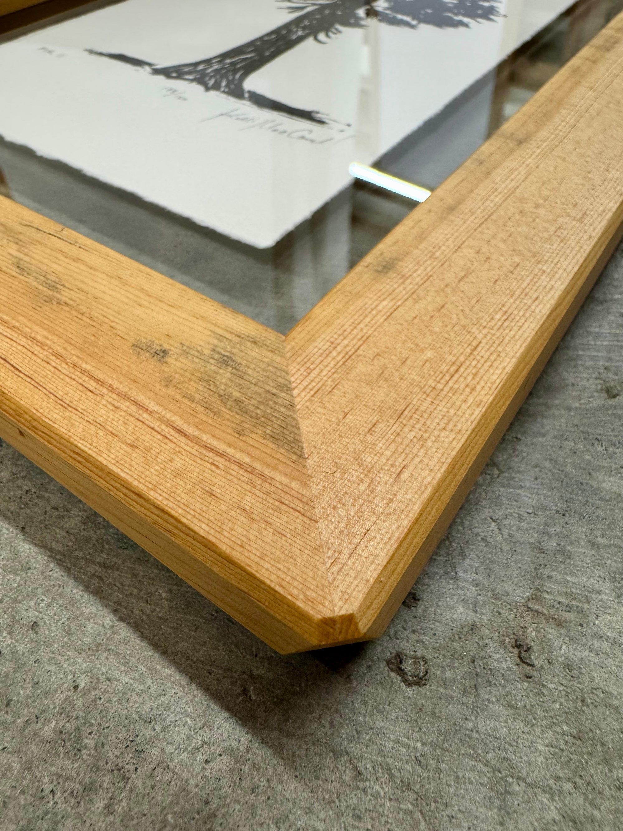 Limited edition hand-pulled letterpress prints on acid-free cotton rag framed in a handmade frames. Frames correspond with the species of trees depicted- salvaged ponderosa, redwood and fir (left to right). The prints are archivally framed with TruVue UV protective Conservation Clear glass.