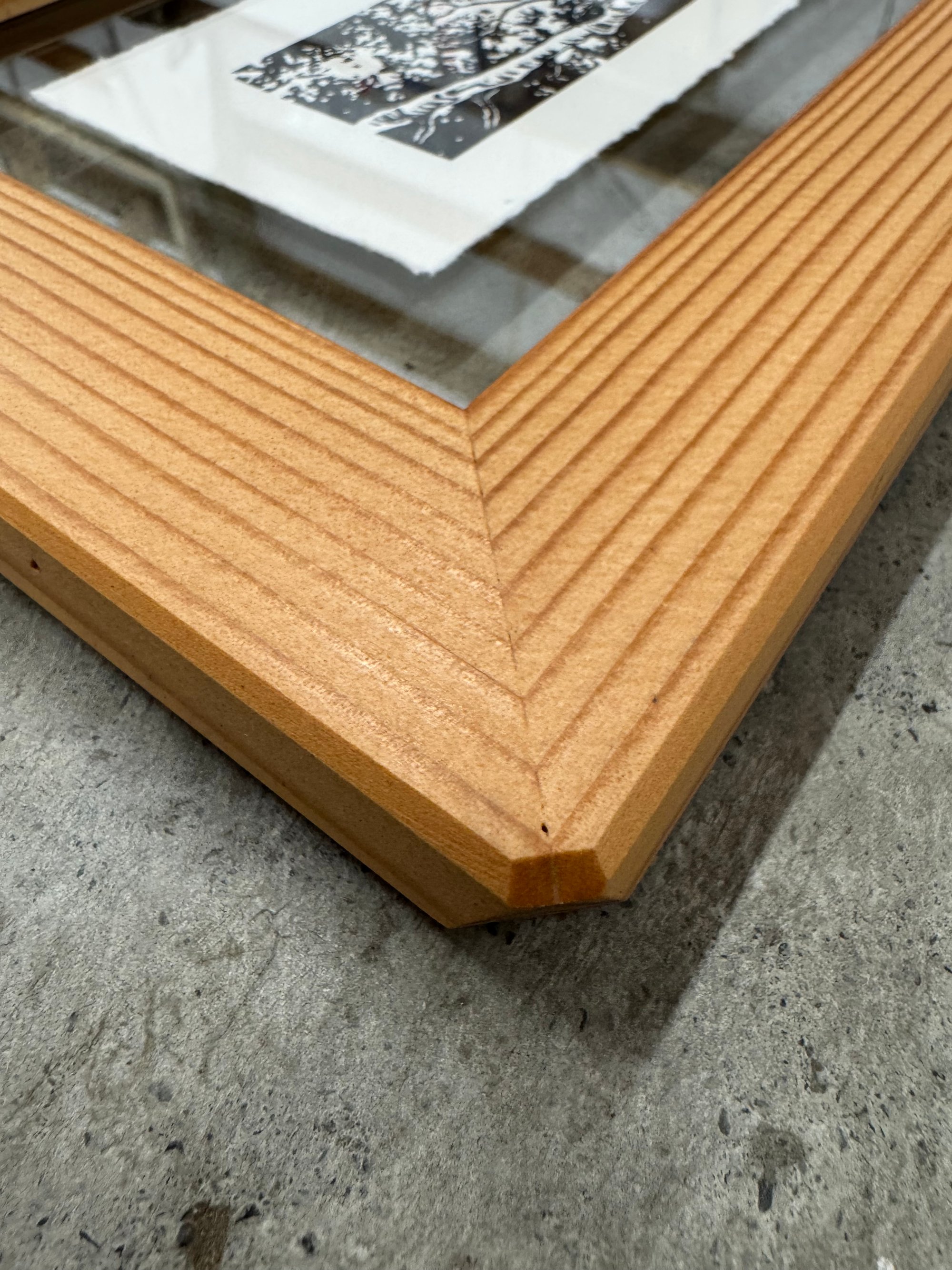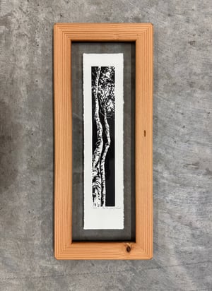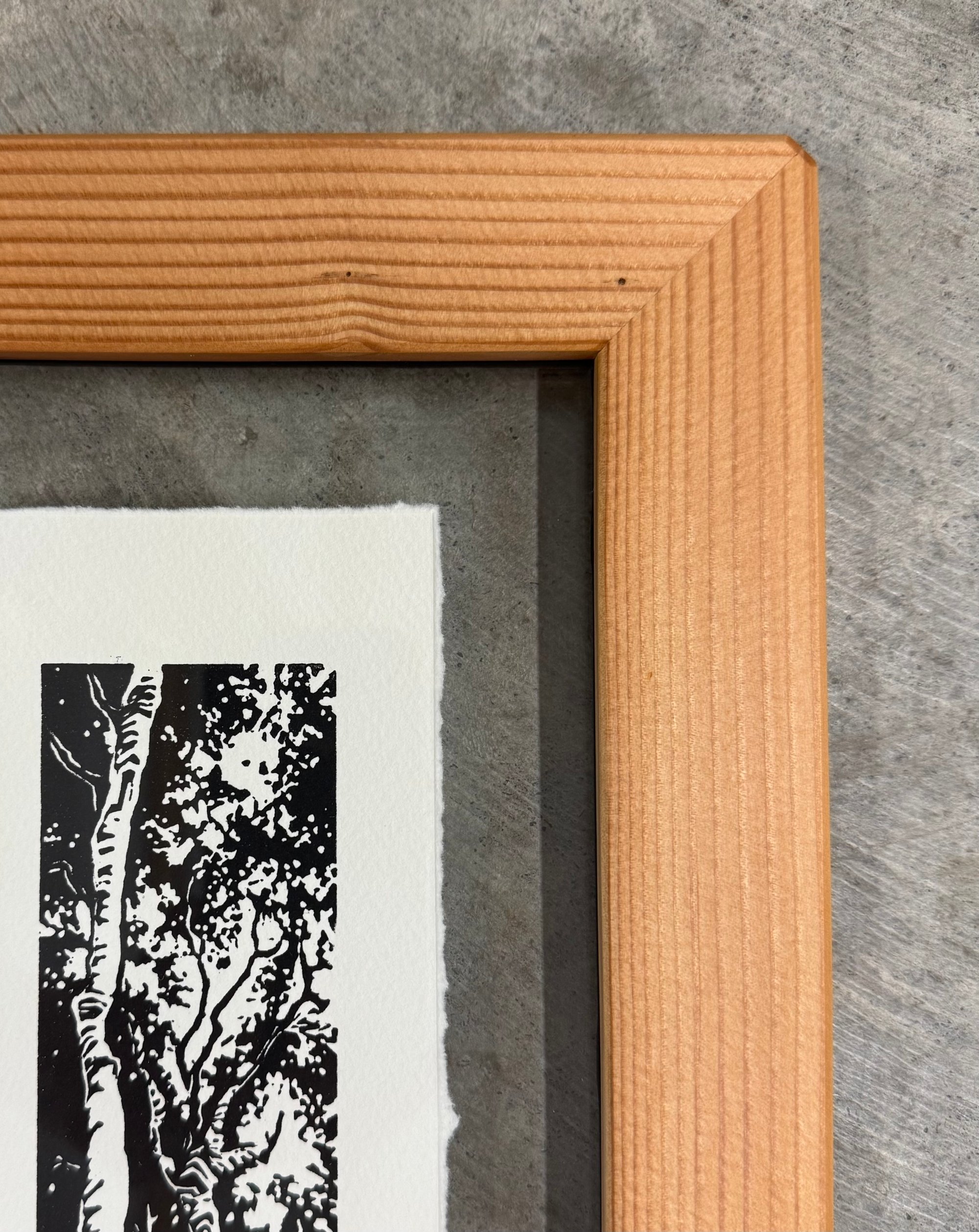 Limited edition hand-pulled linocut print on acid-free cotton rag framed in a handmade fir frame. The print is archivally framed, and the glass is TruVue UV protective Conservation Clear.