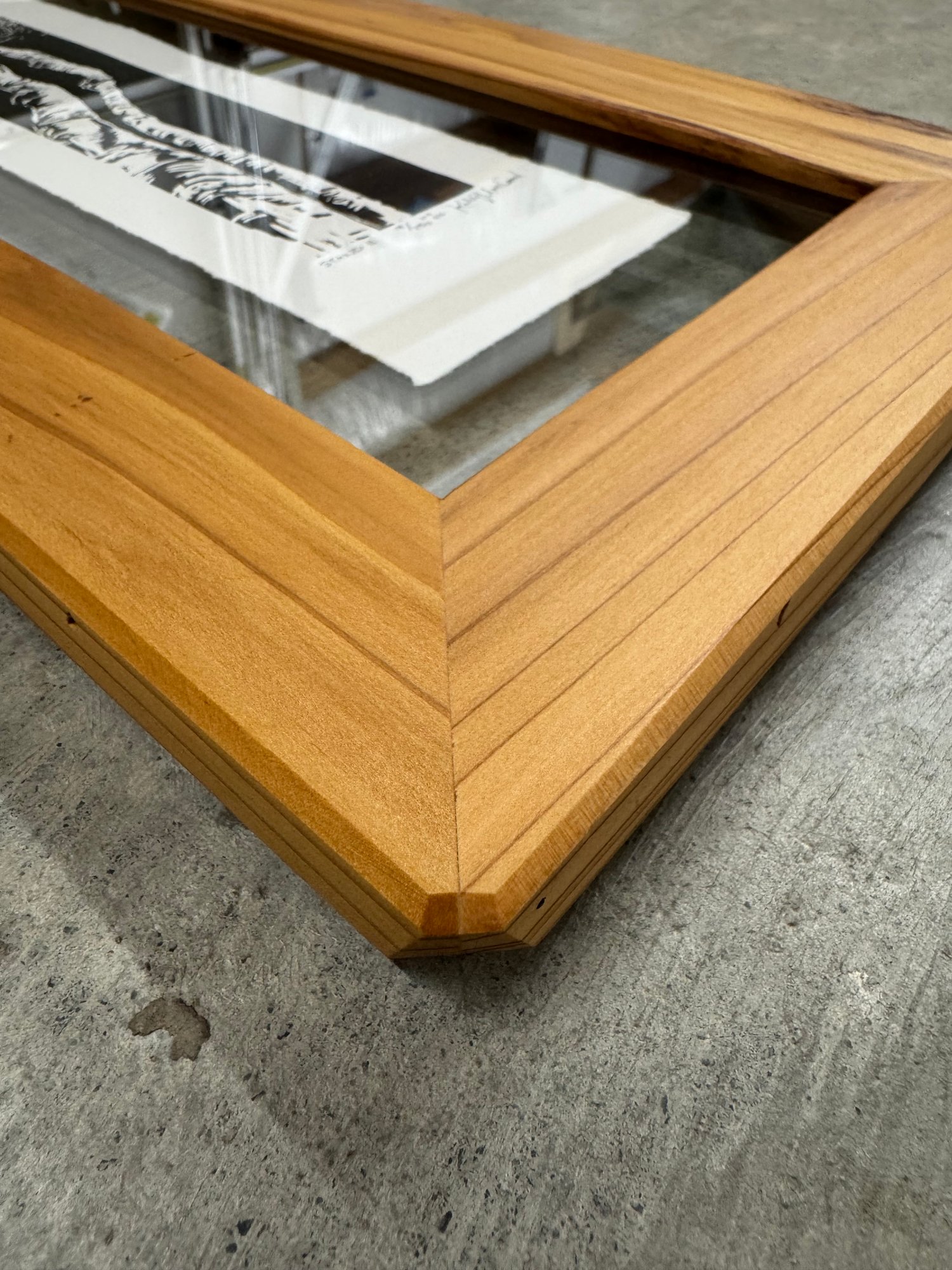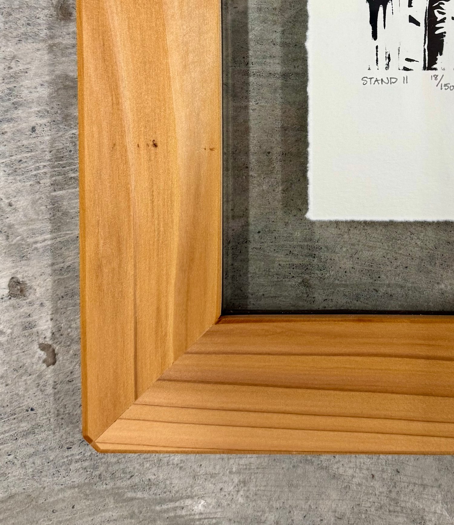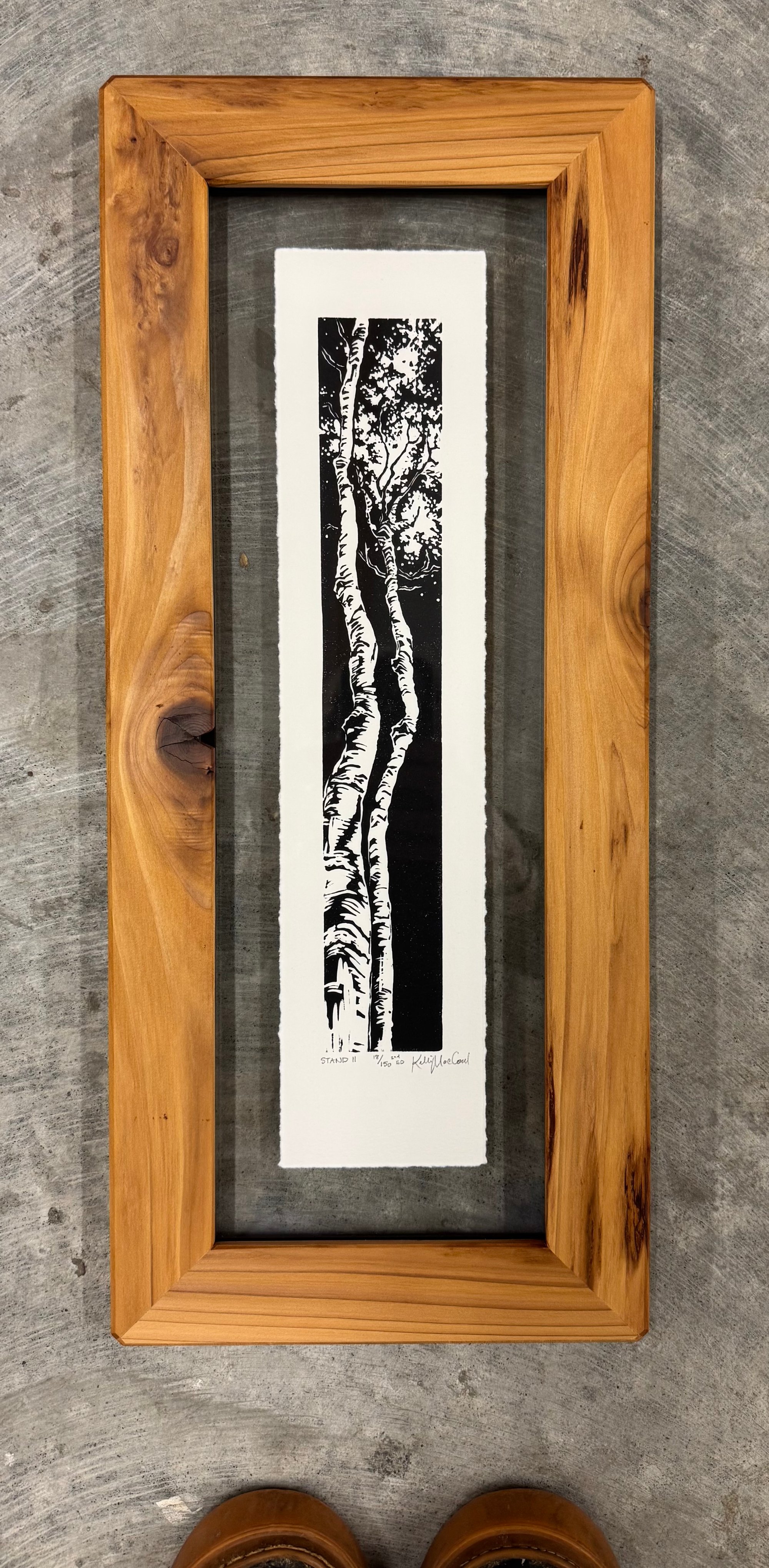 Limited edition hand-pulled linocut print on acid-free cotton rag framed in a handmade cedar frame. The print is archivally framed with TruVue UV protective Conservation Clear glass.