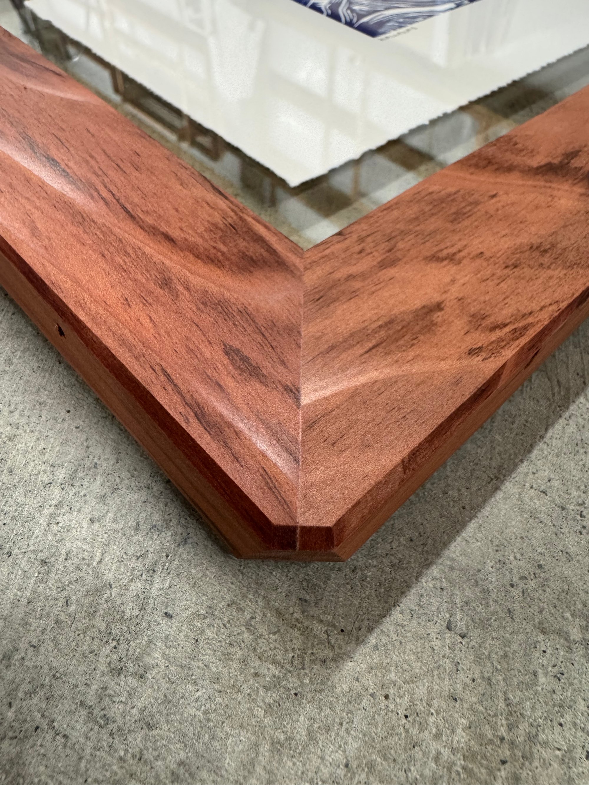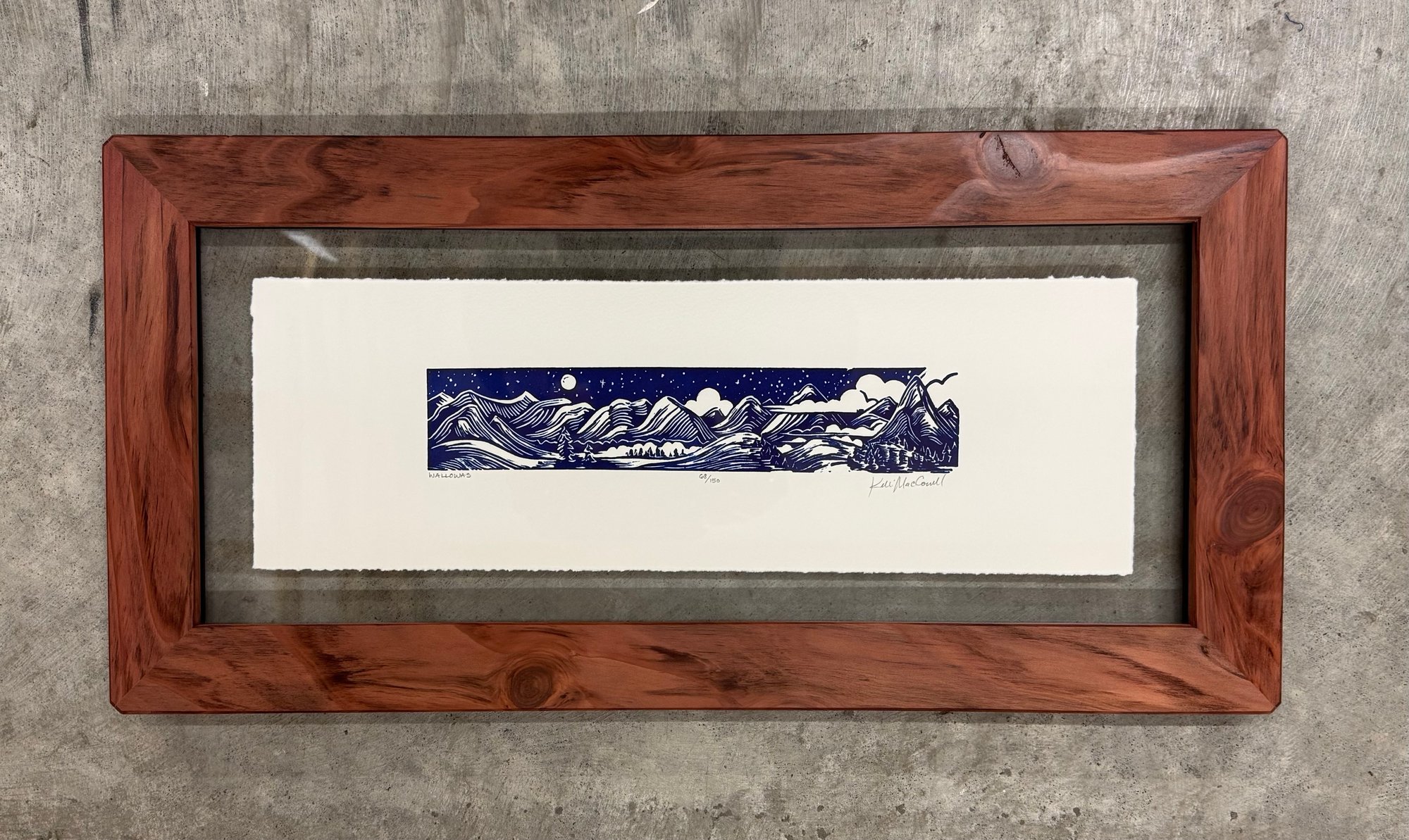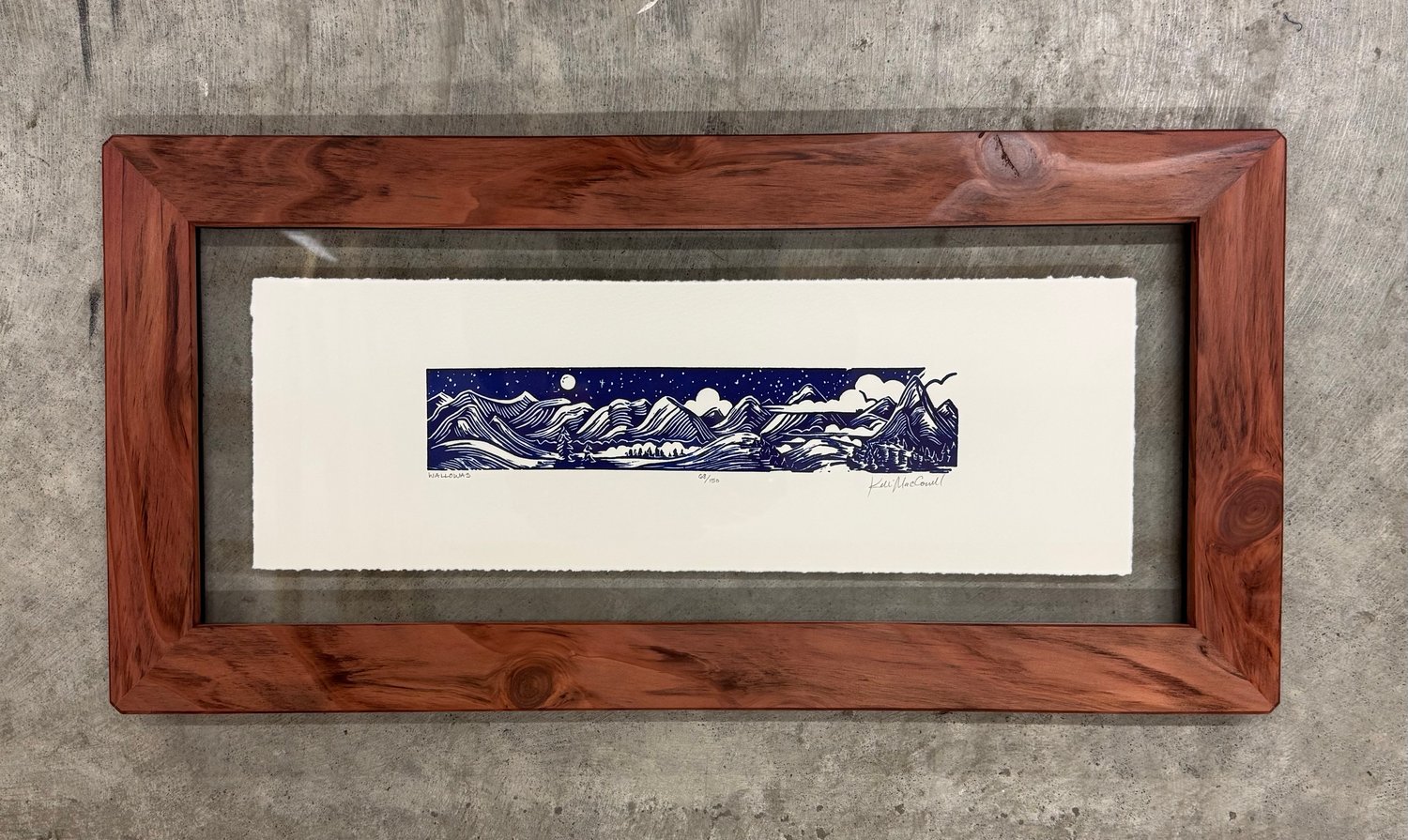 Limited edition hand-pulled linocut print on acid-free cotton rag framed in a handmade redwood frame. The print is archivally framed with TruVue UV protective Conservation Clear glass.