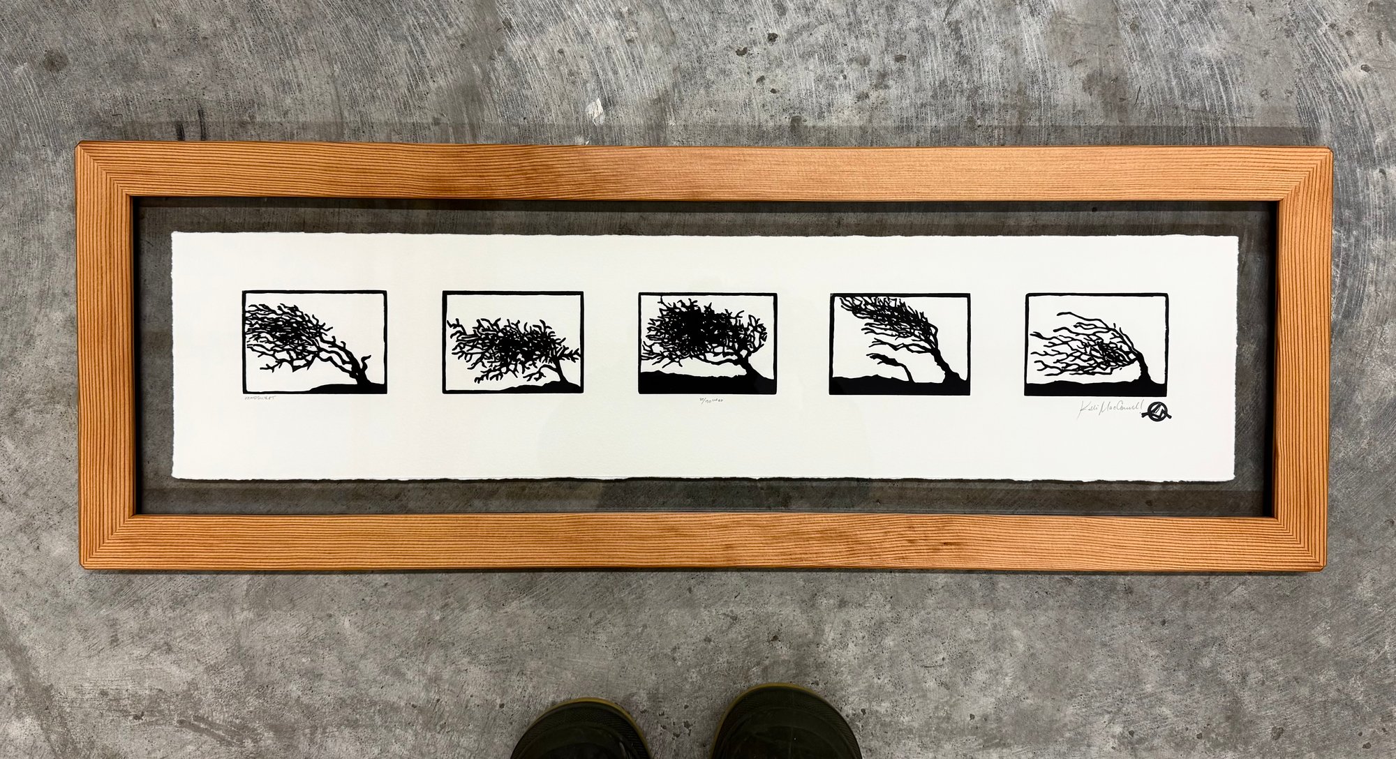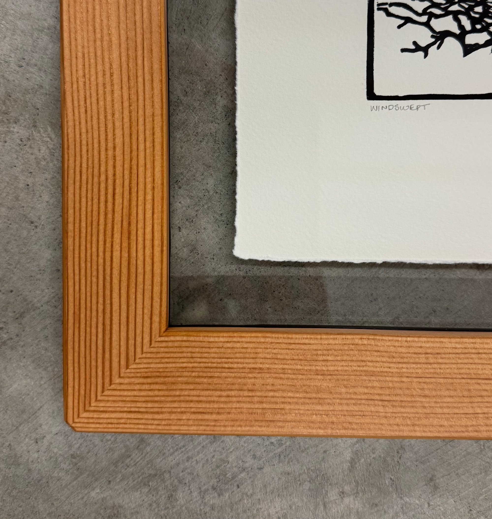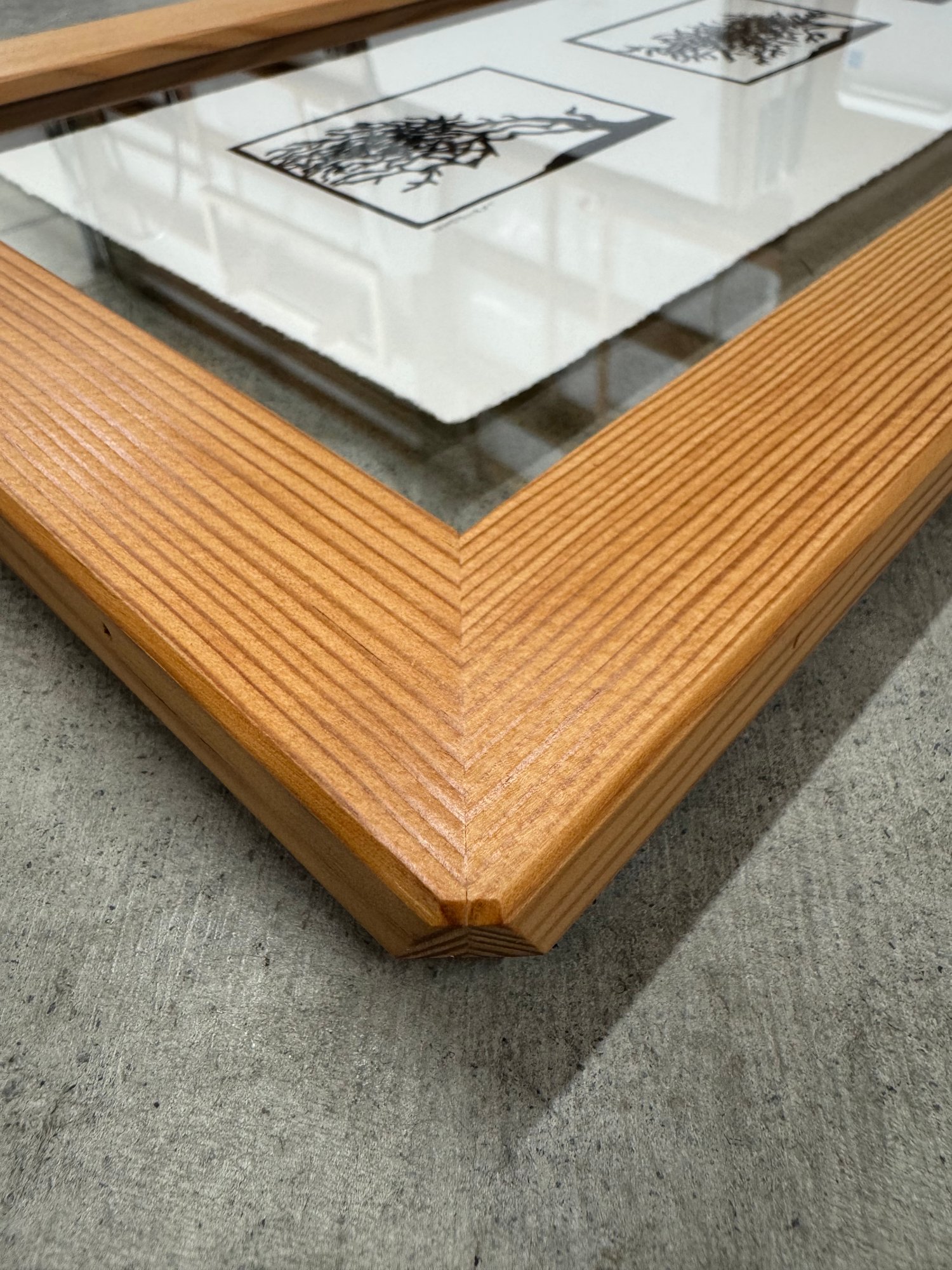 Limited edition hand-pulled linocut prints on acid-free cotton rag framed in a handmade frames. Frames correspond with the species of trees depicted- salvaged hemlock, pine and fir (left to right). The prints are archivally framed with TruVue UV protective Conservation Clear glass.